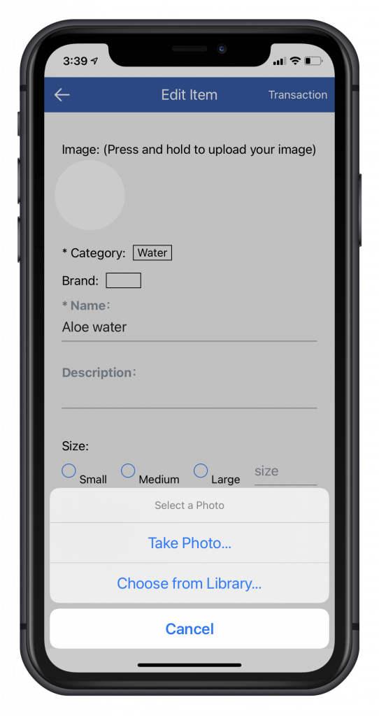 User can set a picture for item by taking photo from camera or selecting from photo library.