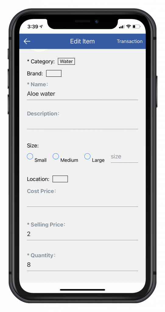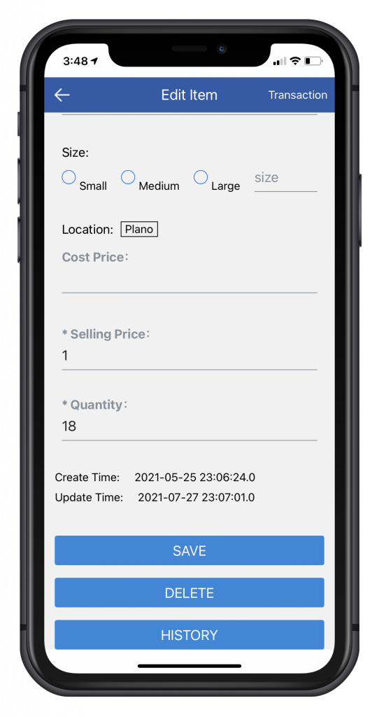 In the bottom, users can update and delete item information, and they can also check the history of transaction.